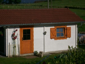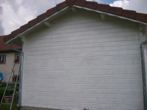 Cet abri de jardin en bois, situé dans le Jura, est entretenu avec le saturateur Coriwood MonoSat’+ en teinte Blanc :